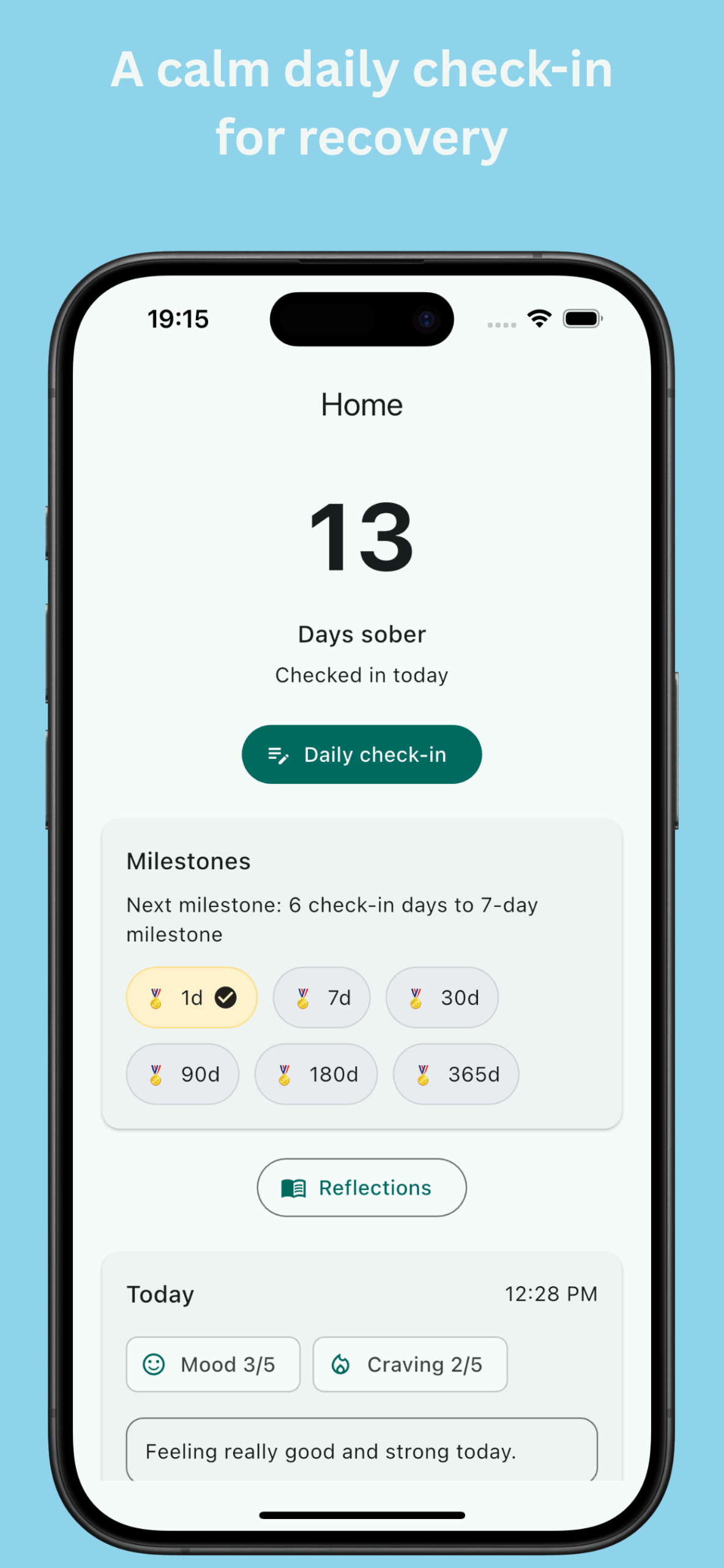 Each day, you can complete a quick check-in that takes less than a minute. You can rate your mood, note cravings, and optionally add a short reflection if something stands out. Over time, these check-ins create a clear picture of how you are doing, without requiring long journaling sessions or complex data entry.